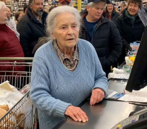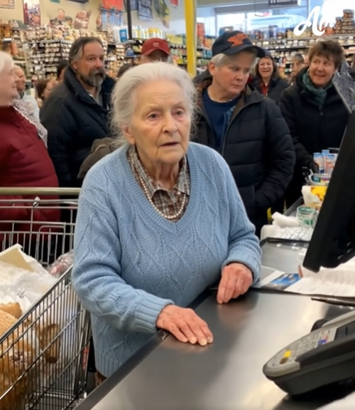 La señora mayor delante de nosotros no parecía distinta a nadie. Cabello gris recogido en un moño bajo, un abrigo que había visto más inviernos que yo y un pequeño carrito con lo básico: pan, leche, sopa enlatada, una bolsa de patatas… y un pastel de manzana.