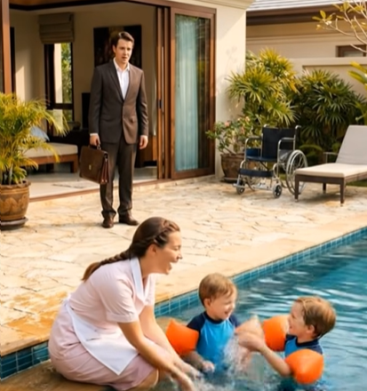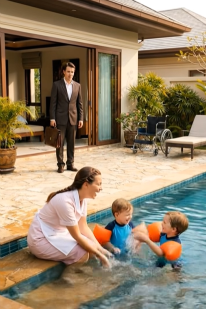Se quedó inmóvil. Vio a sus hijos junto a la piscina. Vio sus manos en el agua. Vio algo que no había visto en años. Mateo rió suavemente. No con voz fuerte. Frágil. Pero era una risa.