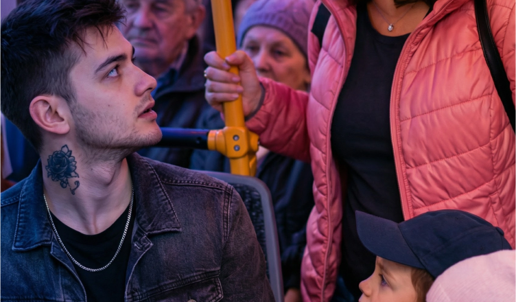 El autobús frenó bruscamente. El joven se levantó despacio y se sujetó a la barra.