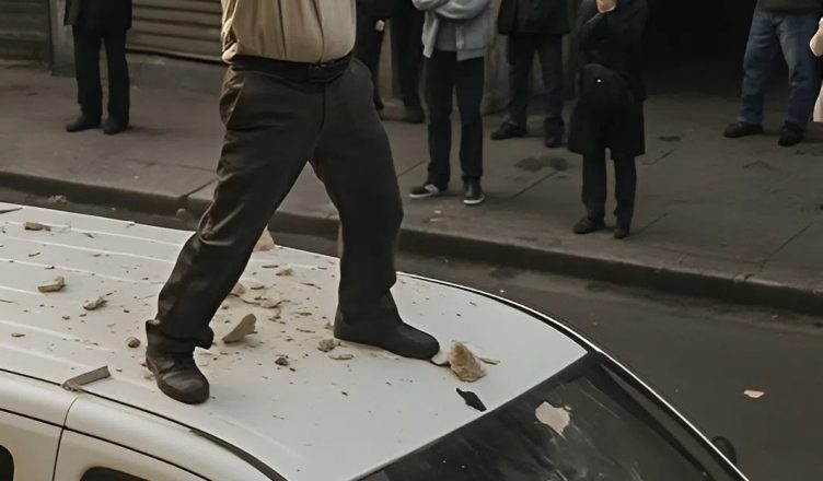 En el techo de una furgoneta blanca estaba un hombre mayor, con el pelo entrecano. Sostenía con ambas manos un mazo pesado, que levantaba por encima de su cabeza con tal furia que se le temblaban los brazos. Cada golpe atravesaba la chapa como si fuera papel. La pintura salpicaba en pedazos afilados sobre el empedrado, el metal se hundía hacia adentro y el parabrisas primero se agrietó en miles de líneas y luego estalló en miles de cristales chispeantes.