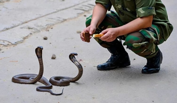 Místo toho, aby nebezpečné sousedy zlikvidoval, začal je krmit. Nejprve byli hadi ostražití a při každém jeho pohybu zvedali kapuce, ale brzy ho přestali považovat za hrozbu. Přicházel téměř každý den, klekl si a házel jim jídlo, pozoroval, jak se opatrně přibližují.