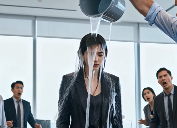El agua helada cayó sobre Isabel como un golpe. Empapada de la cabeza a los pies, el cabello pegado al rostro, la chaqueta saturada de agua y de vergüenza. Algunos empleados retrocedieron instintivamente. Una mujer se cubrió la boca con la mano. Pero nadie intervino.