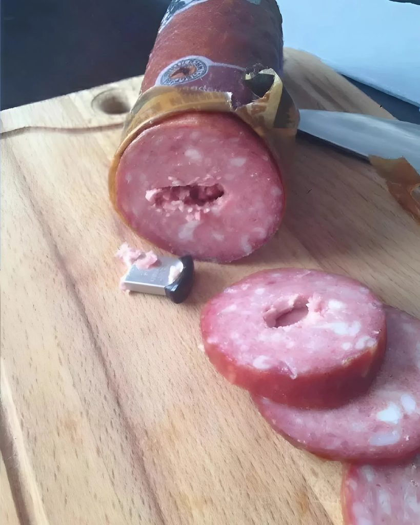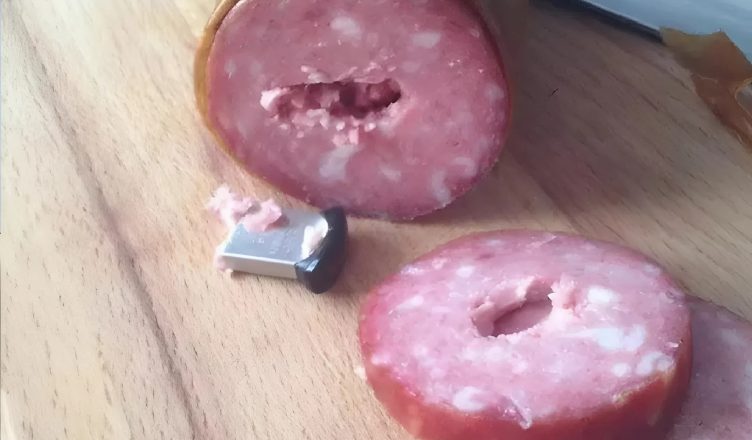 Corté lentamente la superficie y saqué de la salchicha… una memoria USB.