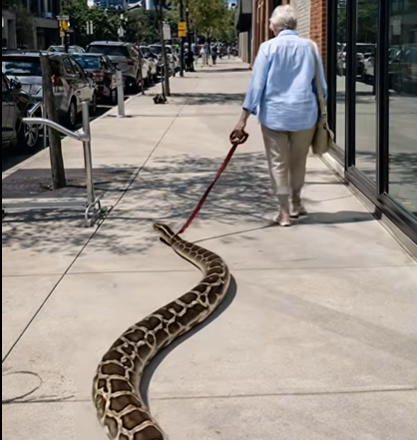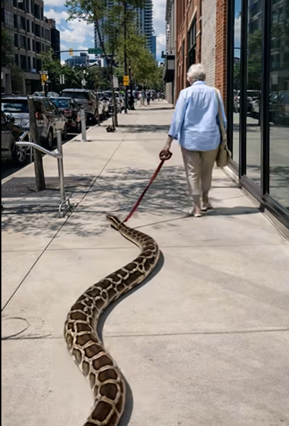 Por la acera se deslizaba lentamente, con un movimiento fluido, el cuerpo masivo de una pitón. La serpiente medía varios metros, era musculosa, con escamas brillantes, y su cabeza se movía muy cerca del suelo. No huía. No atacaba. Simplemente seguía a la mujer, como si fuera la cosa más natural del mundo.