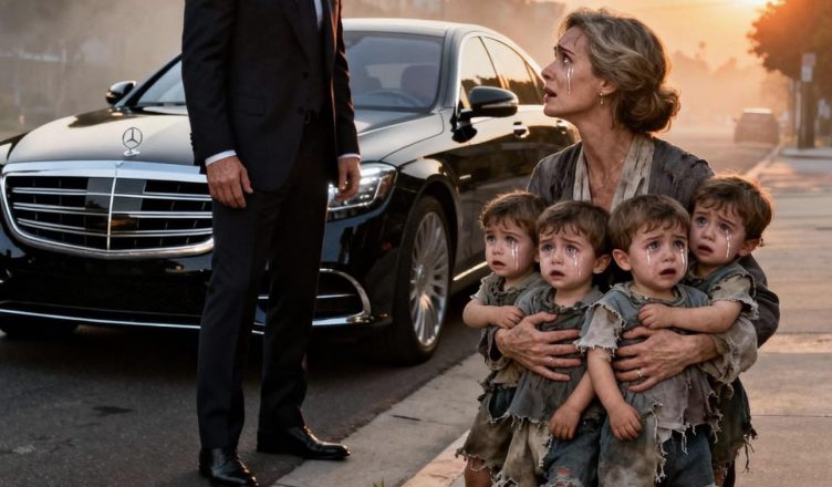 Acababa de bajar de mi coche de lujo cuando, sin querer, crucé miradas con una mendiga al borde de la carretera. El corazón se me detuvo: era ella, la mujer a la que había amado y perdido. Bajó la cabeza de inmediato y apretó contra su pecho a sus cuatro gemelos. Pero cuando levantaron la vista, me quedé atónito: cuatro rostros diminutos… exactamente iguales al mío.