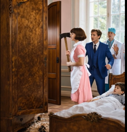 La ama de llaves, sin dudarlo, corrió al sótano y regresó con un hacha. Sus manos temblaban, pero en sus ojos había determinación. Se colocó frente al armario. El padre dio un paso atrás. Los médicos guardaron silencio. Nadie intentó detenerla.